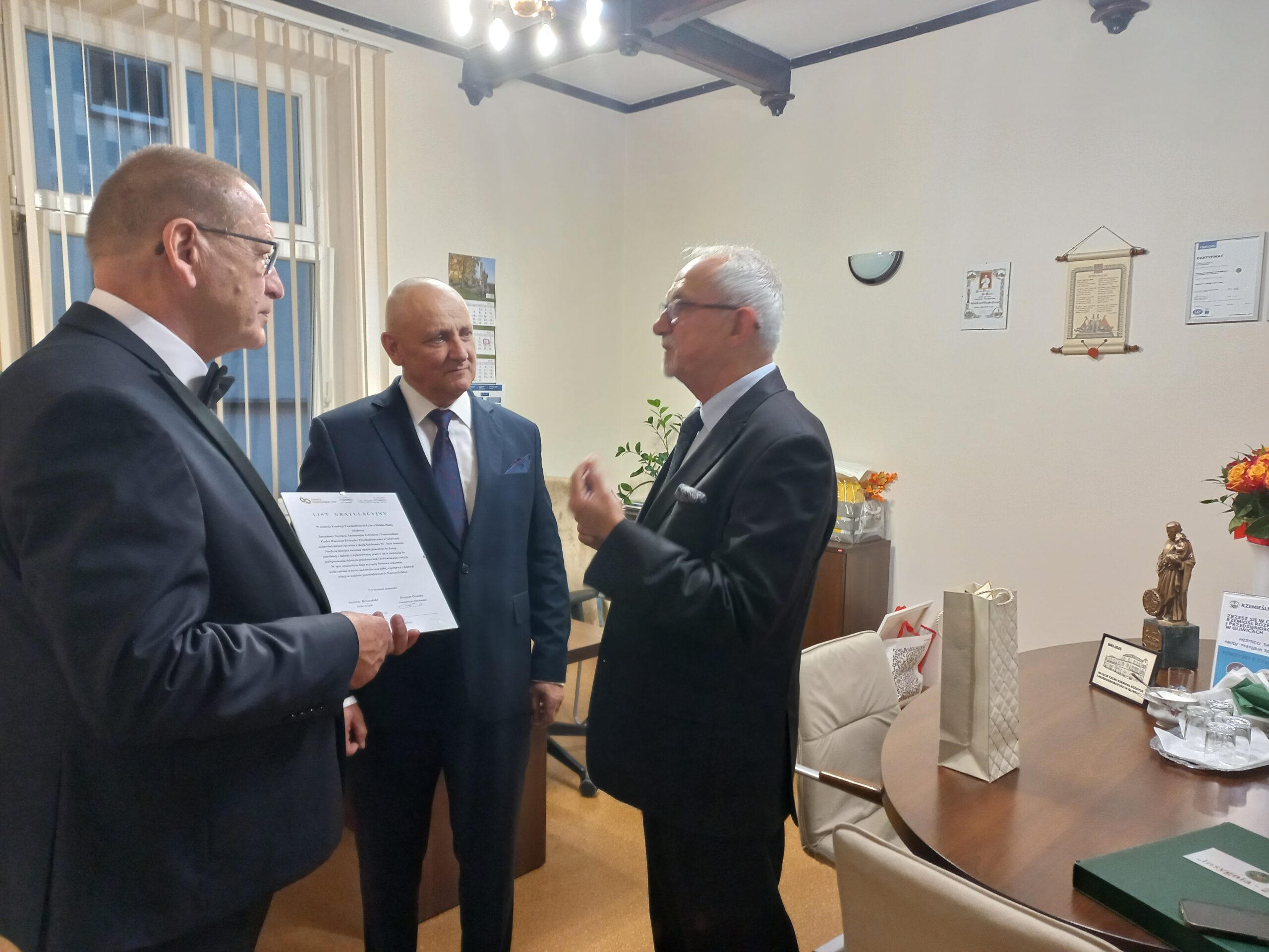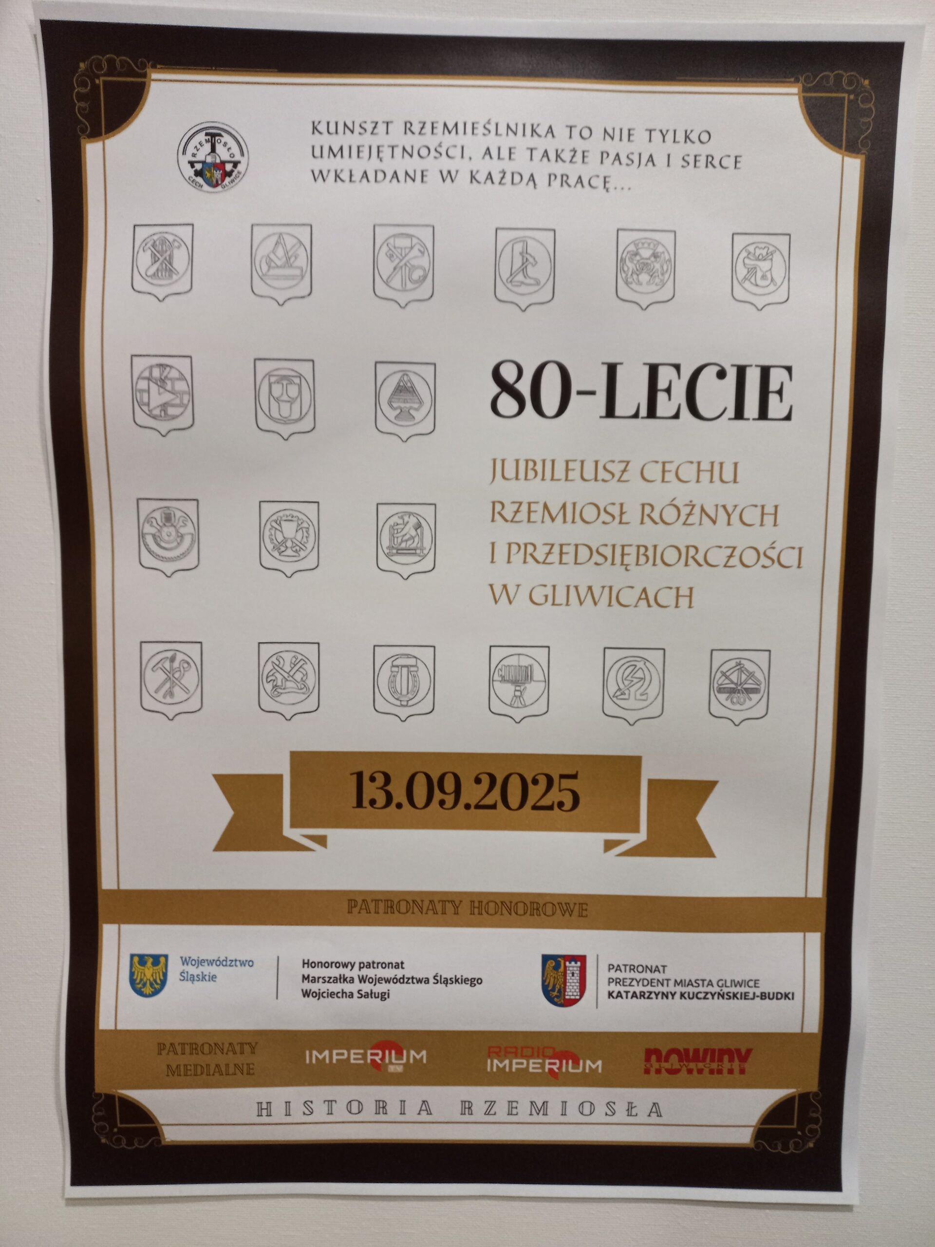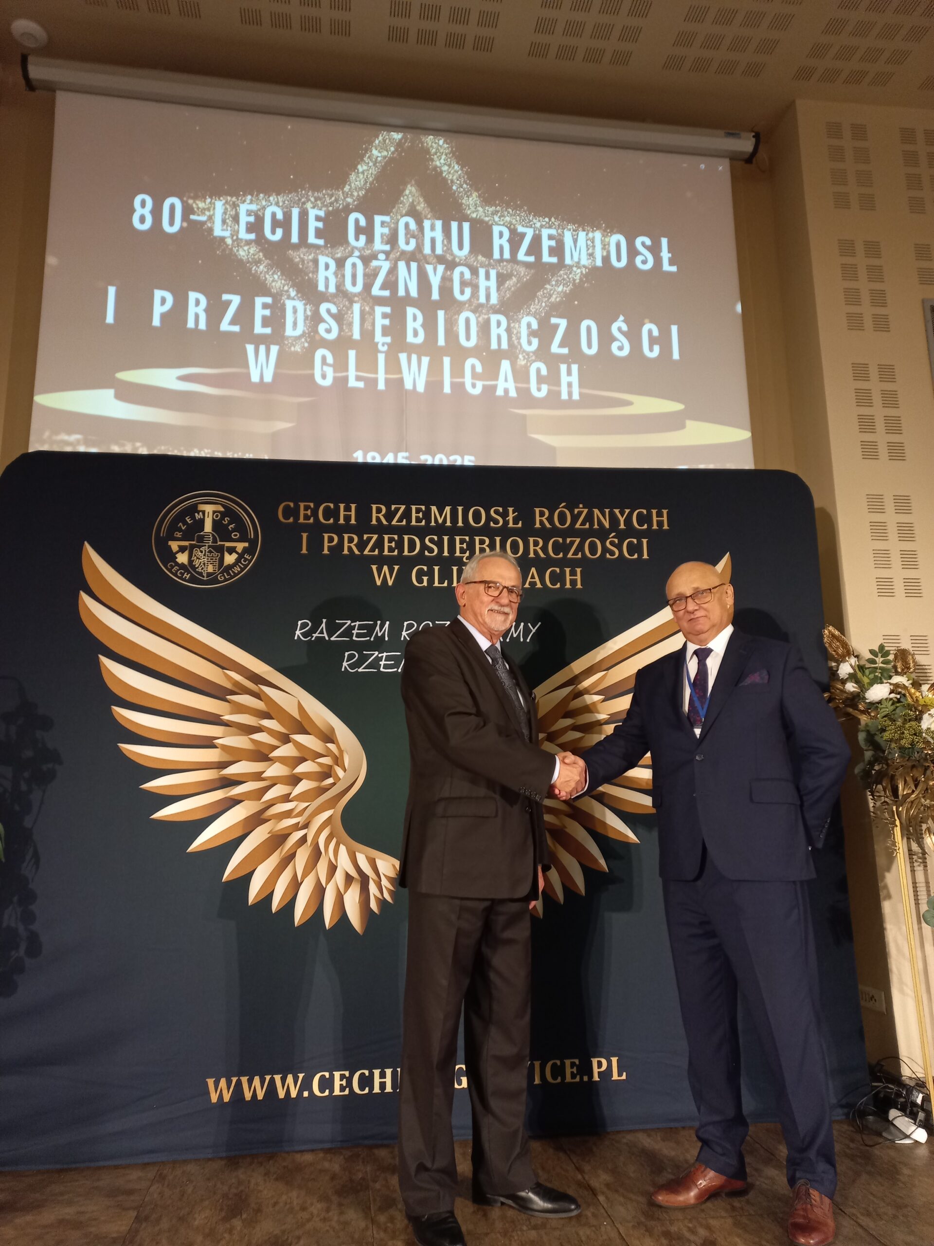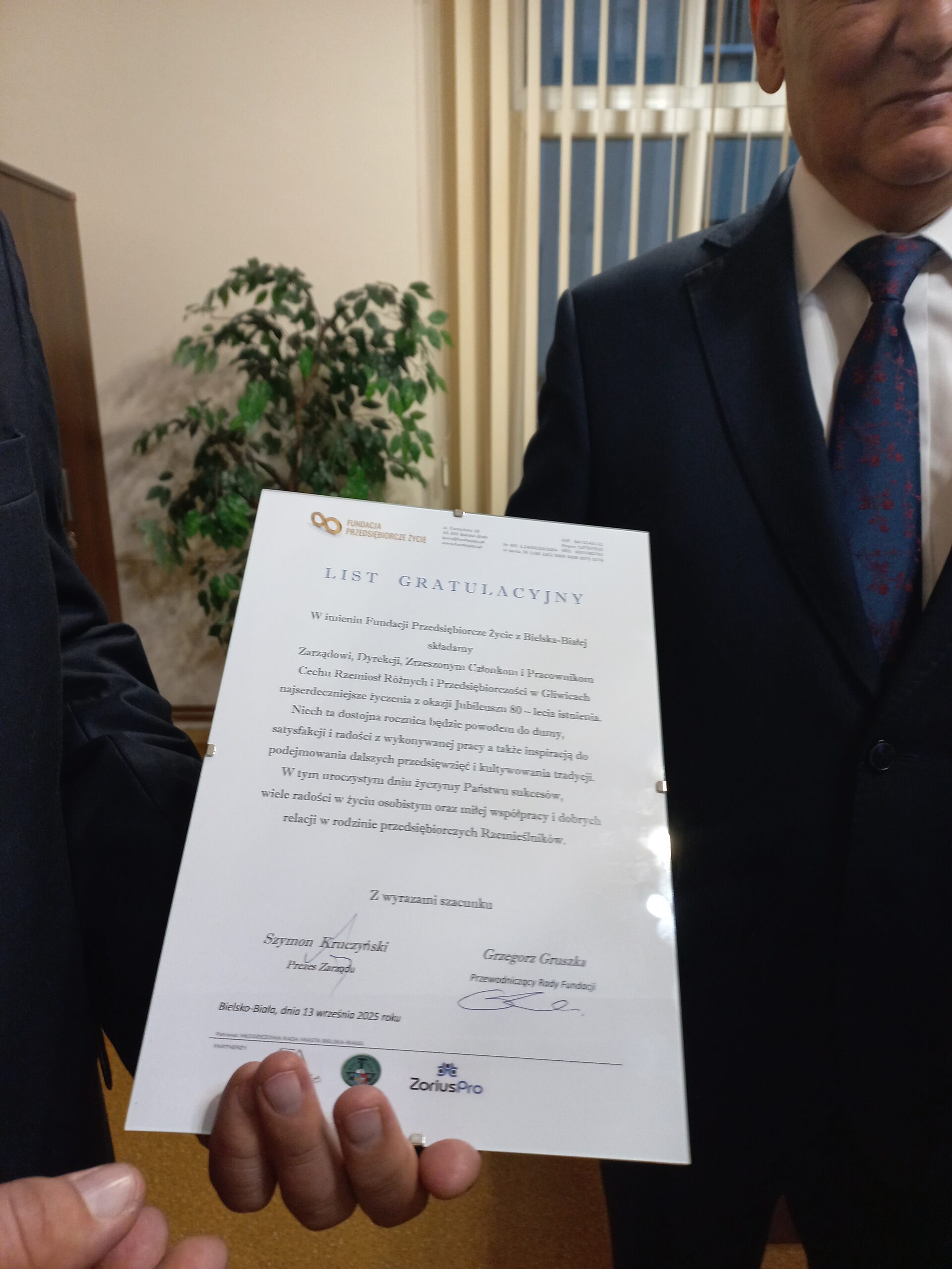 W dniu 13.09.2025 r. odbyła się Gala Jubileuszowa z okazji 80-lecia istnienia Cechu Rzemiosł Różnych i Przedsiębiorczości w Gliwicach. Miałem zaszczyt i przyjemność reprezentować na tym wydarzeniu naszą Fundację, w imieniu której przekazałem na ręce Starszego Cechu Pana Andrzeja Zarzyckiego i Dyrektora Biura Pana Wiesława Jabłońskiego List Gratulacyjny. Życząc naszemu Partnerowi sukcesów w kolejnych latach działalności, wyraziłem nadzieję na dalszą owocną współpracę.